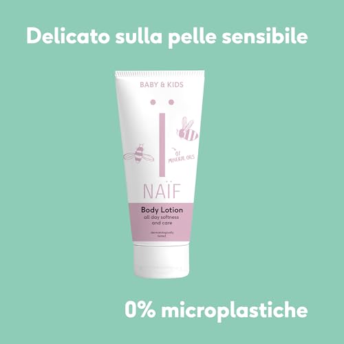 Deze rijke lichaamsmelk, gemaakt van natuurlijke ingrediënten zoals katoen, macadamia, amandel en avocado-olie, hydrateert en voedt de babyhuid. De zachte geur is speciaal ontwikkeld voor de gevoelige huid van baby’s en kinderen. Zonder minerale olie, microplastics en andere ingrediënten verwennen ze de huid van je kleintjes natuurlijk na het baden of douchen. Een ander voordeel: onze crème trekt snel in, plakt niet en is gemakkelijk te verdelen. Alle Naïf-producten zijn veganistisch, dermatologisch getest, vrij van minerale oliën en microplastics. Onze belofte: we zullen je nooit een product verkopen dat we niet voor onze kinderen zouden gebruiken.
