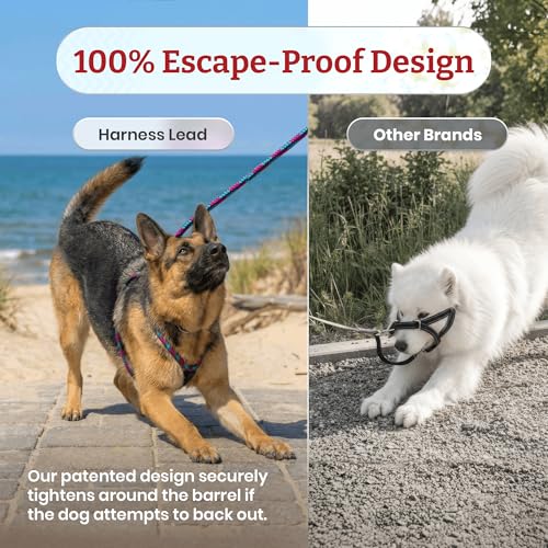 Onbreekbaar ontwerp: het eendelige onbreekbare hondenharnas maakt het voor honden onmogelijk om uit het harnas te komen. Als je hond zich uit het harnas probeert te bevrijden, trekt de lijn automatisch strakker zoals bij een sleeplijn. Het Harness Lead perfecte onbreekbare harnas voor honden met hoge energie en honden tijdens de training. Alleen als loopgereedschap gebruiken. Niet gebruiken om de hond vast te binden. Niet onbeheerd laten staan, omdat de lijn zich aantrekt en niet kauwbestendig is.