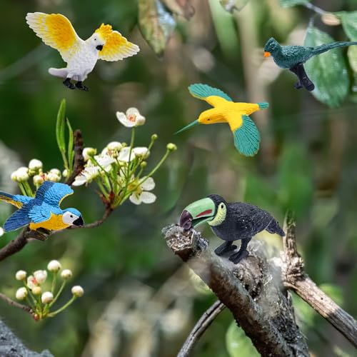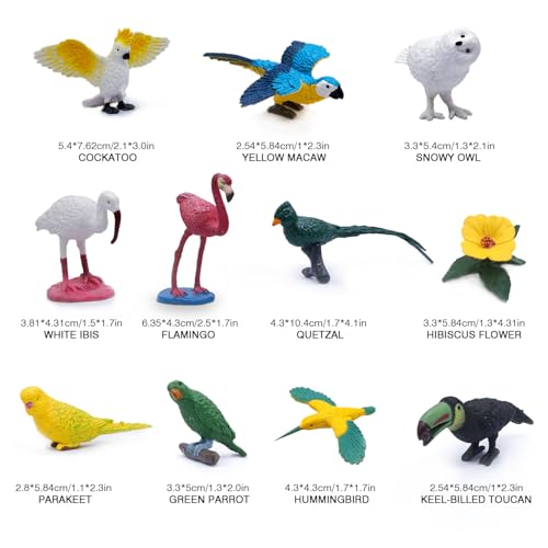 Realistische mini-vogeldierfiguren: 10 stuks unieke, niet-herhalende kunststof vogeldieren, 1 stuk hibiscusbloem met levendige kleuren, natuurlijke look, actieve houdingen, elk figuur is fijn met de hand beschilderd en door experts gevormd, wat authenticiteit garandeert. Tot het speelgoed voor vogeldieren behoren parkieten, quetzal, gele ara, kolibrie, hibiscusbloem, toekan met kielsnavel, kakadu, flamingo, witte ibiis, sneeuwuil en een greet-papegaai.