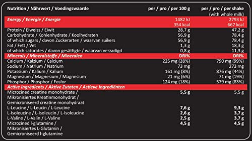 Fructose, instant wei-eiwitconcentraat, maltodextrine, dextrose, gemicroniseerd creatine-monohydraat, bcaas, gemicroniseerd L-glutamine, ei-eiwitpoeder, calciumcaseïnepoeder, chocolade: magermelkpoeder, magermelkpoeder, verdikkingsmiddel E466 cmc, aroma’s, dinatriumfosfat, tricalciumfosfat, vanille en bananen: kleurstof E100 curcumin, aardbeien: kleurstof E120 karmin, natriumchloride, zoetstof E955 sucralose.