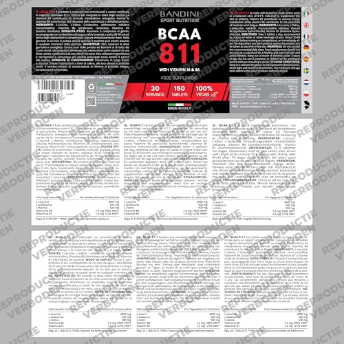 💪 HOGE PRESTATIES. Voedingssupplement op basis van vertakte aminozuren met een uitgebalanceerde 8:1:1 verhouding en verrijkt met vitamine B1 en B6. Doos met 150 tabletten, voor in totaal 30 doses. Bandini Pharma BCAA-aminozuren 811 zijn getest om droge spiermassa te behouden en op te bouwen, om de juiste dosis Leucine, Valine en Isoleucine te leveren, als aanvulling op voeding en sportvoeding.