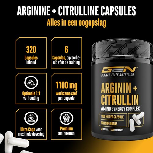 Plaats de eerste recensie voor “L-arginine + L-citrulline – 320 capsules – 1100 mg per capsule – Extra hooggedoseerde Ultra Caps met arginine-base en citrulline in een 1:1-verhouding – Hoogwaardige aminozuurcombinatie”