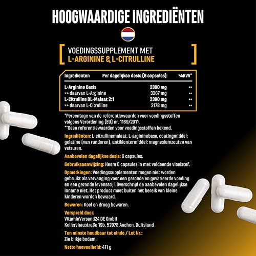 ULTRA CAPS HOOGGEDOSEERD: Elke pot bevat 320 capsules L-arginine en L-citrulline met 1100 mg werkzame stof per capsule. Een dagportie van 6 capsules levert 3300 mg L-arginine-base en 3300 mg L-citrulline-DL-malaat 2:1. Dat komt neer op in totaal 6600 mg aminozuren per dagportie.