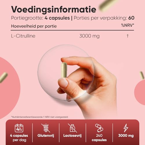 L-citrulline capsules – Deze capsules zijn veganistisch en bevatten alleen plantaardige ingrediënten. De capsules zijn gemakkelijk te slikken en bevatten 3000 mg. Daarnaast is dit supplement vrij van GMO’s, lactose, gluten en magnesiumstearaat.