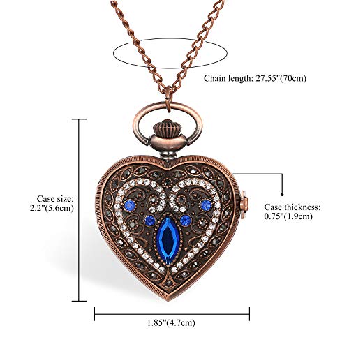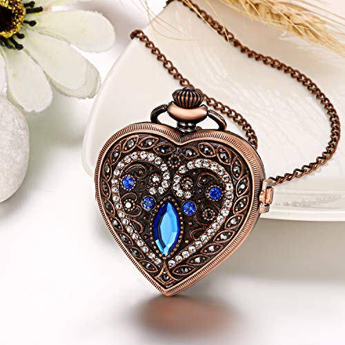 JewelryWe Mannen Vrouwen Pocket Horloge Quartz Horloge Rhinestone Hart Hanger Ketting Horloge, 2 stuks (groen/blauw)