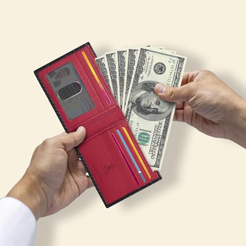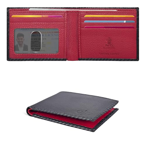 Echt lederen portemonnee voor heren – RFID Slim Bifold Creditcard ID Minimalistische Dunne Portefeuilles Cadeau voor Mannen, Zwart Koolstof/Rood, S, Casual