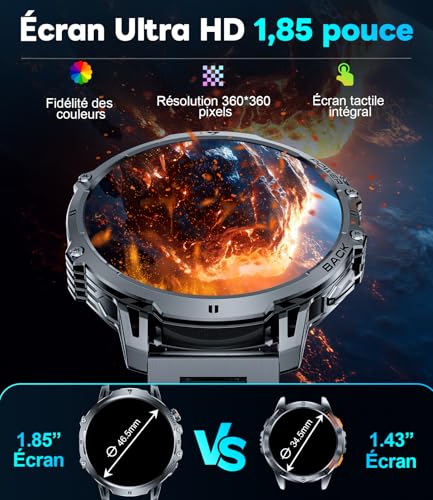 【1,85 inch IPS-HD-display en meer dan 200 wijzerplaten】 De DREMAC 2026 smartwatch voor heren beschikt over een 1,85 inch high-definition display dat scherpe en gedetailleerde beelden en instelbare helderheid biedt, wat een heldere zichtbaarheid ook bij direct zonlicht garandeert. Een verversingssnelheid van 60 Hz garandeert een soepele werking. Meer dan 200 wijzerplaten zijn beschikbaar om te downloaden. De led-zaklamp met 800 lumen aan de zijkant biedt meer dan 2 uur looptijd in noodgevallen. Als je de voorkeur geeft aan grote schermen, is deze DREMAC smartwatch de ideale keuze!