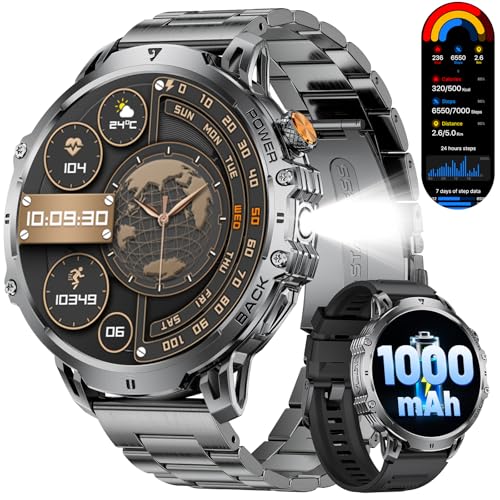 DREMAC Smartwatch voor heren, militair, 1000 mAh/1,85 inch, groot scherm/oproep/led-lamp, 130 sportmodi, waterdicht IP68, fitnesshorloge met hartslagmonitor, SpO2, slaap, voor Android iOS