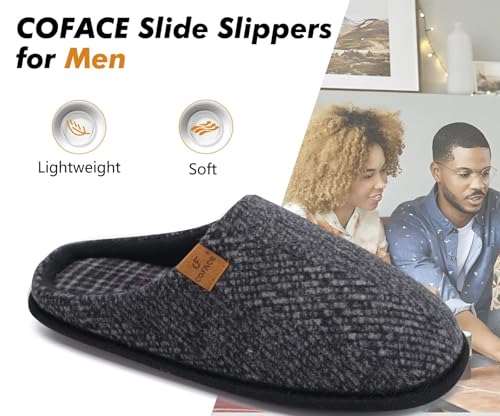 COFACE Huispantoffels voor heren zijn gemaakt van vilt bovenwerk en ultra zachte geruite katoenen voering, zachte aanraking kan zorgen voor je voeten, houdt je warm en ademend. Het algehele ontwerp van huisschoenen ziet er eenvoudig uit, maar vol casual en mode, geschikt voor lente, zomer, herfst en winter. De pantoffels voor heren hebben traagschuim met hoge dichtheid en steunkussen voor de voetboog, dat goede ondersteuning en schokabsorptie kan bieden, waardoor je het gevoel hebt dat je op wolken loopt die je voeten maximaal gezellig houden. En de verbeterde muilezelpantoffels voor heren met een duurzame, gripvaste rubberen antislipzool voorkomen extreem uitglijden of glijden, of je ze nu binnen of buiten draagt. Deze huispantoffels zijn goed voor mannen, thuis, huis, slaapkamer, kantoor, hotelkamer, yogasporten, reizen, wandelen met de hond enz.