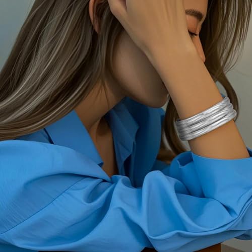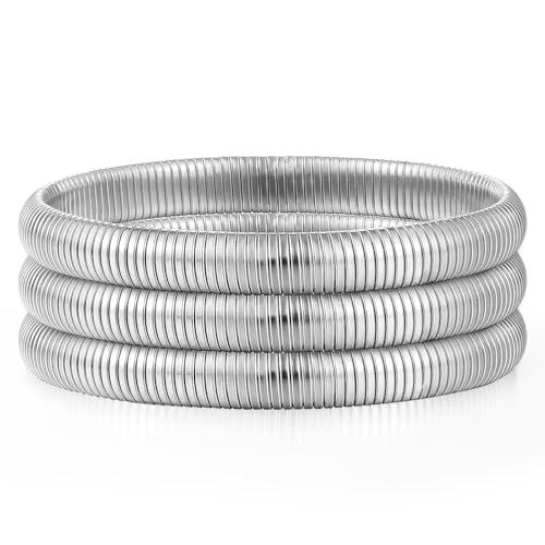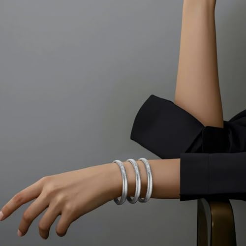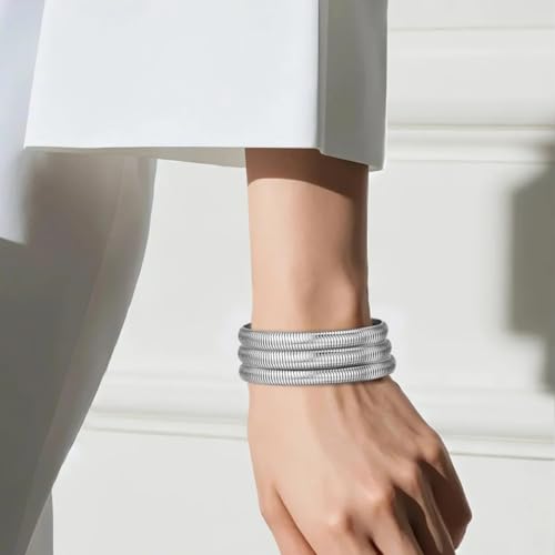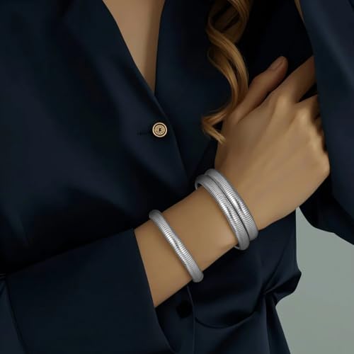 Emibele Silver Bangle Bracelet Set 3Pcs, 8mm Chunky Titanium Non Tarnish Titanium Bracelet Stack, Flexible Stretch Wide Wristband Bangle Layered Snake Chain Bracelet for Women