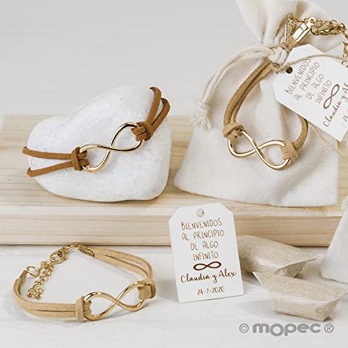 Originele en elegante armbanden met oneindigheidssymbool. Perfect om een sentiment te tonen door een detail Zeer combineerbaar. Deze bruine suède armbanden met gouden oneindigheidssymbool zijn zeer geschikt om cadeau te geven aan gasten bijvoorbeeld op een bruiloft. Verkocht in twee tinten bruin. Met de kettingsluiting kun je de diameter van de armband in verschillende maten aanpassen en de karabijnsluiting is zeer veilig. Een geweldige manier om uit te drukken dat het beste gevoel voor altijd is.
