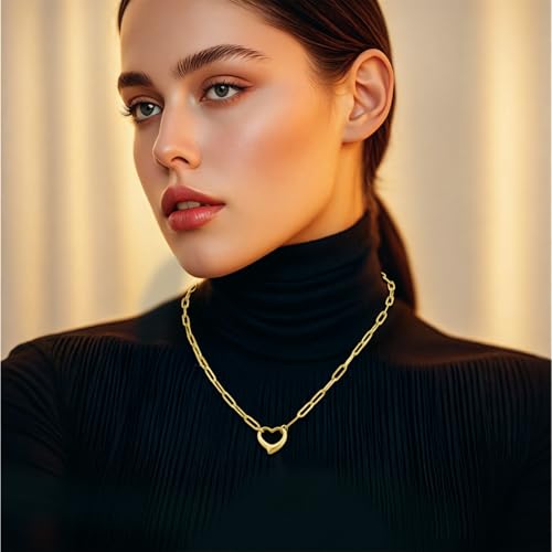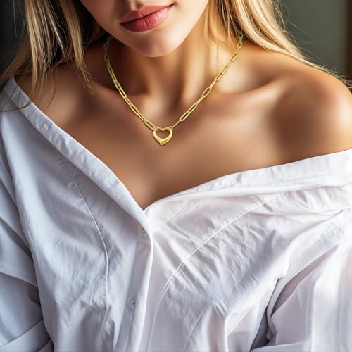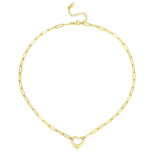 Emibele Dainty Gold Heart Charm Necklace for Women, Stainless Steel No Tarnish 18K Gold Plated Necklaces with Love Heart Pendant & Paperclip Chain, Valentines Birthday Jewelry Gifts for Women