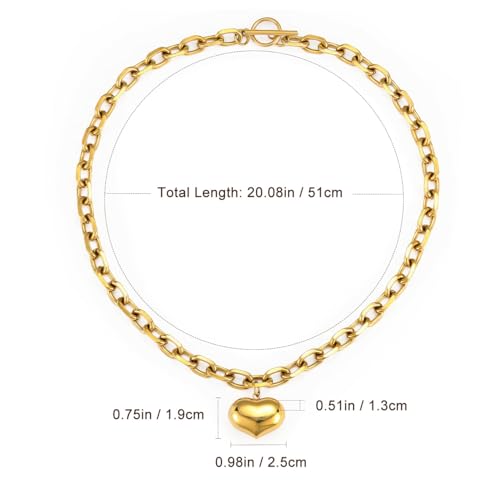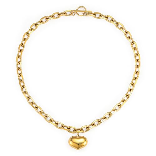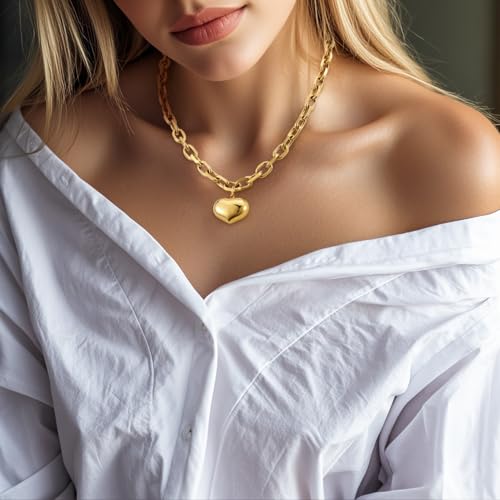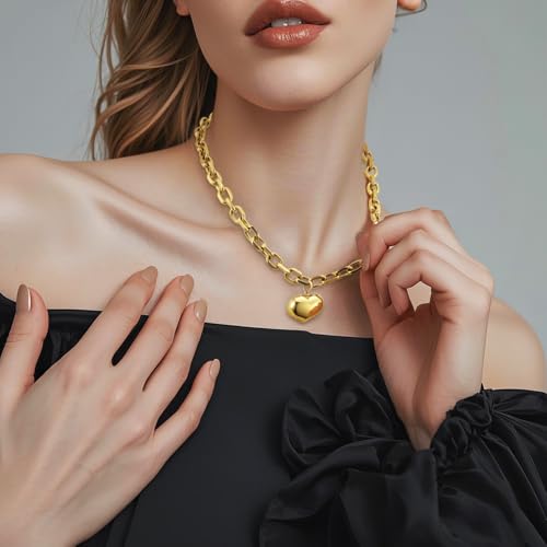 Emibele Gold Puffy Heart Charm Chunky Necklace for Women, 18K Gold Plated Stainless Steel No Tarnish Necklaces with Love Pendant & OT Clasp, Gold Statement Necklace Trendy Jewelry Gifts for Women