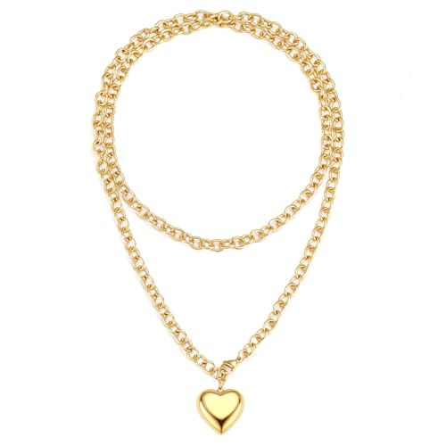 Emibele Gold Puffy Heart Charm Chunky Necklace, Stainless Steel No Tarnish 18K Gold Plated Layered Choker with Love Pendant & Long Chain, Gold Statement Necklace Trendy Jewelry Gifts for Women