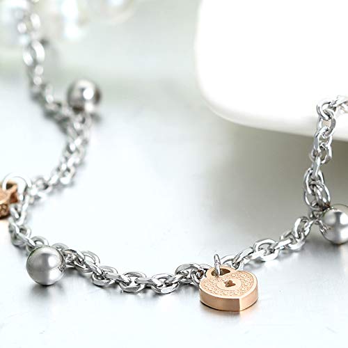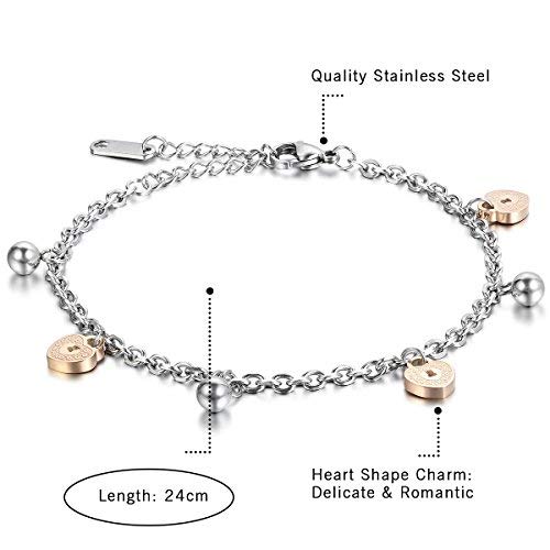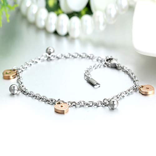 Cupimatch Enkelbandje van roestvrij staal, roségoud, zilver, hartjes, klokken, hanger, enkelketting, armketting voor dames, meisjes en vrouwen, 24 cm, Roestvrij staal, zonder steen